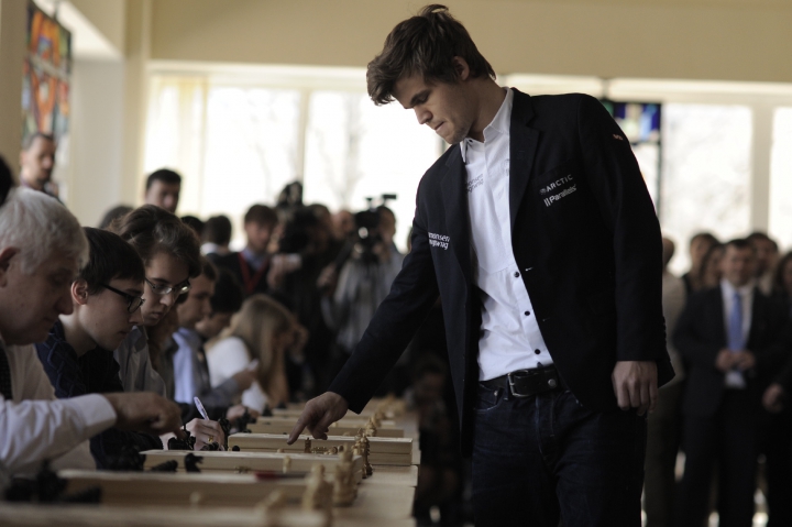 8 апреля Магнус Карлсен по приглашению Ассоциации выпускников Физтех-Союз и Runa Capital.гостил в Долгопрудном у студентов и преподавателей Московского физико-технического института. Чемпион мира ответил на многочисленные вопросы любителей шахмат и дал сеанс одновременной игры. Ведущей вечера была Тина Канделаки.