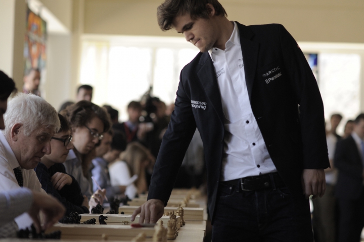 8 апреля Магнус Карлсен по приглашению Ассоциации выпускников Физтех-Союз и Runa Capital.гостил в Долгопрудном у студентов и преподавателей Московского физико-технического института. Чемпион мира ответил на многочисленные вопросы любителей шахмат и дал сеанс одновременной игры. Ведущей вечера была Тина Канделаки.