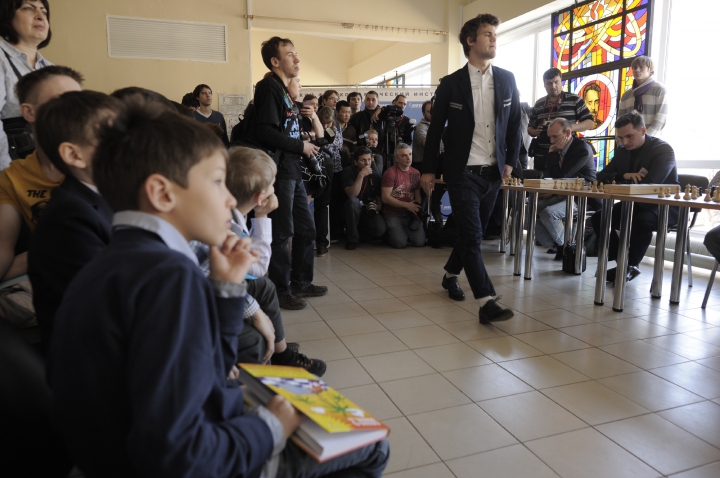 8 апреля Магнус Карлсен по приглашению Ассоциации выпускников Физтех-Союз и Runa Capital.гостил в Долгопрудном у студентов и преподавателей Московского физико-технического института. Чемпион мира ответил на многочисленные вопросы любителей шахмат и дал сеанс одновременной игры. Ведущей вечера была Тина Канделаки.
