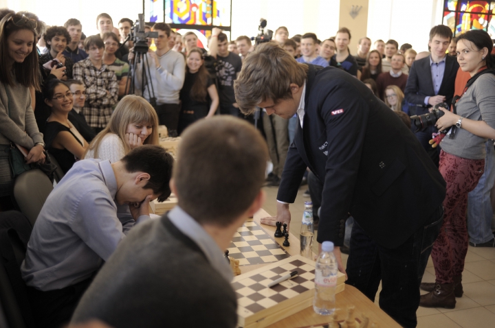 8 апреля Магнус Карлсен по приглашению Ассоциации выпускников Физтех-Союз и Runa Capital.гостил в Долгопрудном у студентов и преподавателей Московского физико-технического института. Чемпион мира ответил на многочисленные вопросы любителей шахмат и дал сеанс одновременной игры. Ведущей вечера была Тина Канделаки.