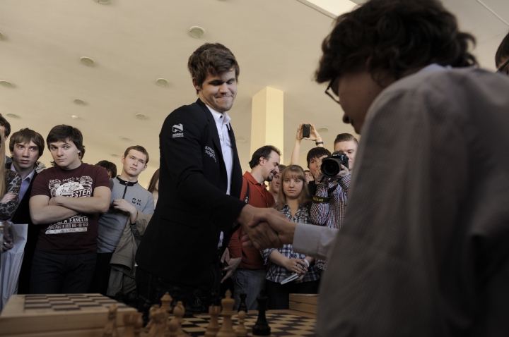 8 апреля Магнус Карлсен по приглашению Ассоциации выпускников Физтех-Союз и Runa Capital.гостил в Долгопрудном у студентов и преподавателей Московского физико-технического института. Чемпион мира ответил на многочисленные вопросы любителей шахмат и дал сеанс одновременной игры. Ведущей вечера была Тина Канделаки.