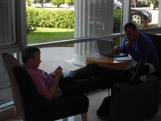 Пока Руслану Пономареву и тренеру Александру Сулыпе подыскивают номер, они коротают время с помощью современных технологий