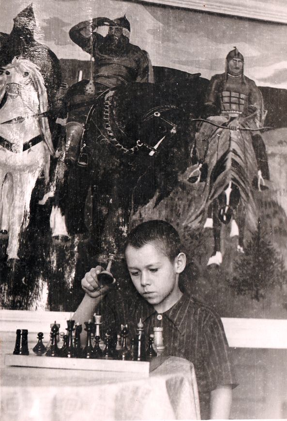 «...Удивителен прожектор памяти: вот он высвечивает бегущие нечёткие кадры далёкого 1960 (или 1961) года. Первенство Кемерова по шахматам среди школьников. Помню себя, тогда даже не перворазрядника, входящим на очередной тур в здание центральной 62-й школы. Видимо, не все партии начинались одновременно – какие-то уже игрались. Едва войдя в зал, я увидел толпу участников, окруживших один из столиков. Вытянув шею из-за спин, разглядел маленького худенького мальчика, игравшего со здоровенным старшеклассником. Никакого сомнения: все столпились ради этого «хлюпика» с горящими глазами.