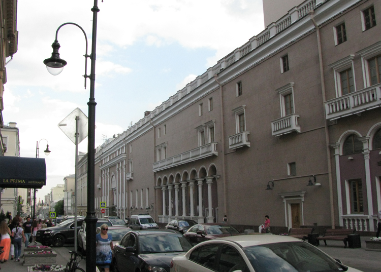 Осталось не так и много пройти до конца улицы. Почти напротив театра оперетты, на стороне Камергерского переулка, завершает Большую Дмитровку творение Казакова — здание Благородного собрания, 1775 года постройки, ныне Дом союзов. Здесь танцевали на балах Татьяна Ларина и Наташа Ростова.