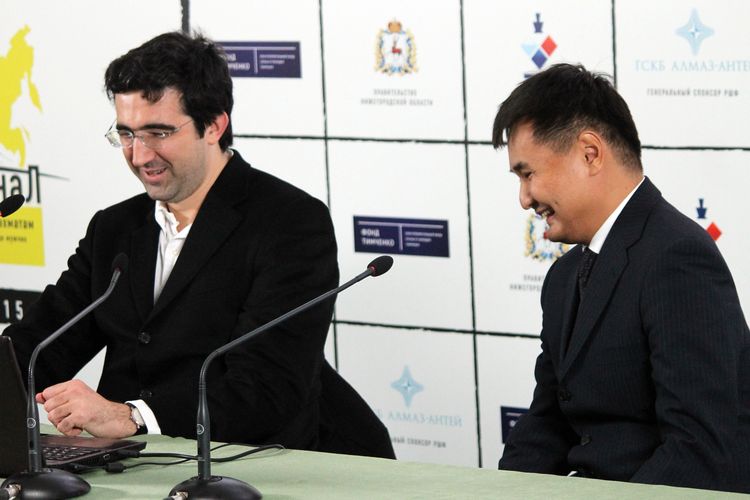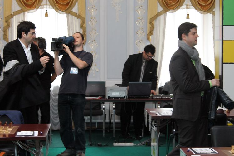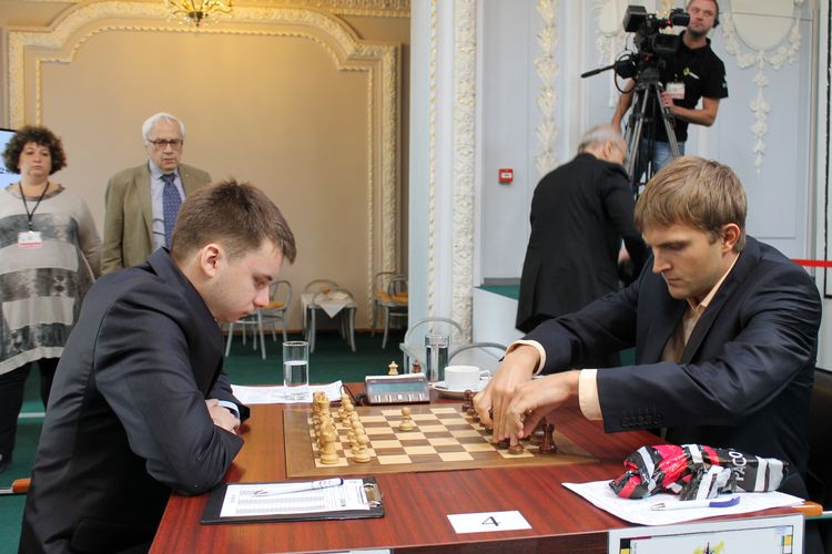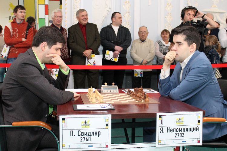 Очень острая, изобиловавшая тактическими тонкостями борьба развернулась в партии Петра Свидлера и Яна Непомнящего. Белые с первых ходов попытались развить атаку на королевском фланге, а черные – по классическим канонам – ответили контрударом в центре. Чтобы переломить неблагоприятное течение борьбы, Свидлер двинул пешку от короля g2-g4; как пошутил на пресс-конференции Ян Непомнящий, он решил, что соперник сыграл «all in» (и сопроводил шутку характерным движением рук, при помощи которого игроки в покер выдвигают все свои фишки на середину стола). Но оказалось, что кое-какие «фишки», то есть определенный запас прочности в позиции белых еще оставался, сама по себе она не развалилась. Черные же в цейтноте допустили несколько неточностей и остались вначале без качества, а потом и без достаточной за него компенсации. В эндшпиле, наверное, можно было защищаться упорнее, а в концовке многократному чемпиону России удалось создать небольшой симпатичный этюд.