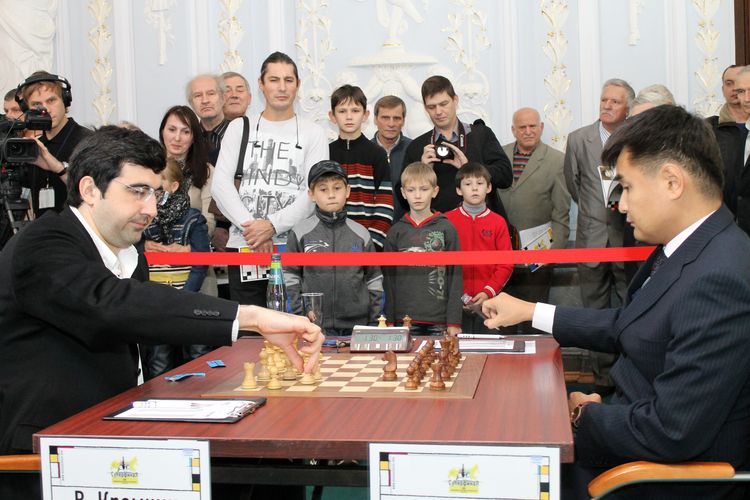 В первом туре назревала громкая сенсация: в партии Крамник – Шомоев компьютерная оценка в один момент доходила до «+2» в пользу дебютанта Суперфинала. Восьмым ходом обладатель Кубка мира весьма творчески пожертвовал качество, но полной компенсации за него не получил. Антон до поры защищался очень точно, однако тратил при этом много времени на обдумывание. Чтобы поддержать напряжение, Владимир отдал еще и коня за пару пешек. Критическая позиция возникла после 19-го хода белых.