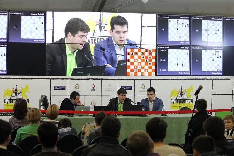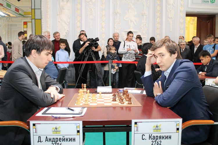 Вторым одержал победу второй финалист недавнего Кубка мира – Дмитрий Андрейкин. Его партия с Сергеем Карякиным в какой-то момент напоминала игру в кошки-мышки: черные полностью игнорировали угрозы соперника на королевском фланге, и белые могли быстро завершить борьбу в свою пользу, вскрыв линию «h» и перебросив туда своего ферзя. План стандартный, а кроме того, на прошлогоднем Суперфинале Андрейкин выиграл в похожем стиле у Санана Сюгирова, и «гвоздем» в той атаке тоже было вторжение белого коня на h7. Однако Дмитрий после длительного обдумывания сыграл иначе и почти позволил Сергею выйти сухим из воды. Но тут последовала новая серия ошибок со стороны черных, и во второй раз Андрейкин своего шанса не упустил.