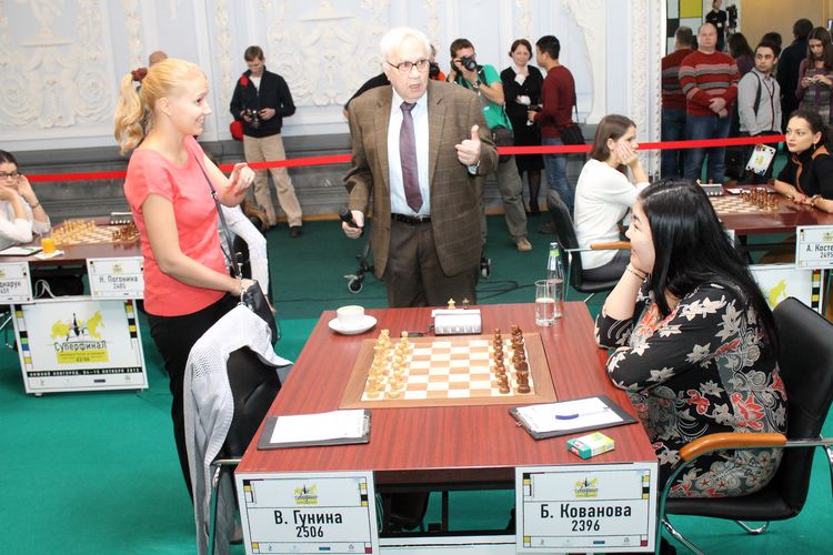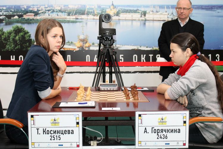 Татьяна Косинцева и Александра Горячкина посвятили вечер углубленному изучению одного из разветвлений системы Россолимо в сицилианской защите. Саша очень четко разыграла дебют и добилась уравнения. Попытки Татьяны запутать юную соперницу успехом не увенчались; так в этот вечер родилась на свет единственная ничья.