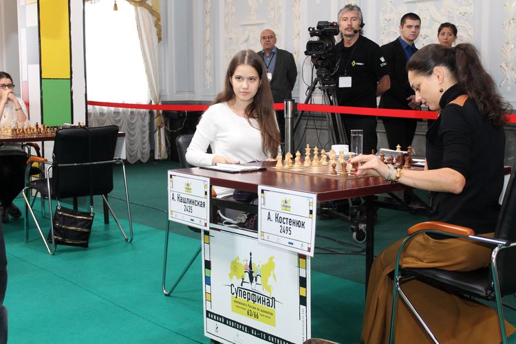 Белые преподнесли сопернице дебютный сюрприз (Кашлинская на Суперфинале делает это постоянно). Александра в ответ начала импровизировать, пожертвовала пешку, после чего уже Алина стала подолгу задумываться. Судя по всему, принимать «данайский дар» белым не следовало, поскольку в партии черные сумели очень активно расположить свои фигуры и задержать неприятельского короля в центре. Исход баталии решила прямая атака на короля.