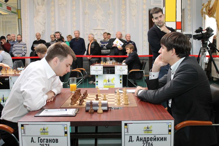 Дмитрий Андрейкин разыграл против Алексея Гоганова свой любимый дебют Тромповского, благодаря которому «навел шороху» на Кубке мира в Тромсё. Проверенное оружие и на сей раз не подвело. Возникла примерно равная позиция, где каждая из сторон имела свои плюсы. У черных – два слона и более гибкая пешечная структура, у белых – надежный король (тогда как его визави застрял на е7). Как ни банально звучит эта фраза, но играть белыми было легче. Стоило Гоганову чуть-чуть ослабить бдительность, как он тут же пропустил мощный прямой удар.