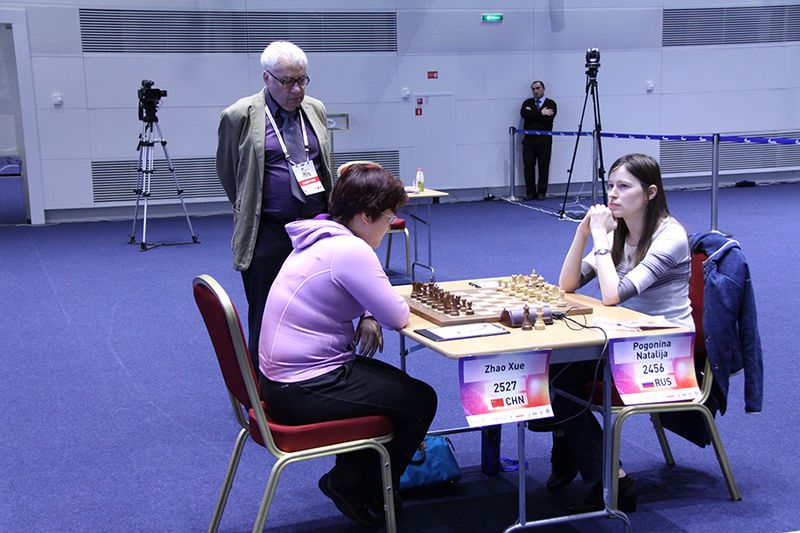 Погонину в партии с Чжао Сюэ, видимо, убаюкало плавное течение каталонского миттельшпиля. На 29-м ходу она допустила пешечный подрыв, после которого центральная вертикаль открылась для черных ладей, а слабости ферзевого фланга белых стали ощутимыми. Впрочем, на этой стадии разноцветные слоны еще были союзниками российской шахматистки. Несмотря на потерю пешки, ее позиция даже не была хуже. Затем Наталья допустила неточность, позволив сопернице защитить пешку f7. Однако и здесь при наличии на доске ладей белые практически ничем не рисковали. Предложение их размена стало серьезной ошибкой, поскольку в чистом разноцвете у черных в придачу к проходной по линии «h» имелась возможность образовать проходную на другом фланге. В концовке получились классические «штаны»: белый слон, лишившись помощи короля, не смог разорваться на два направления.