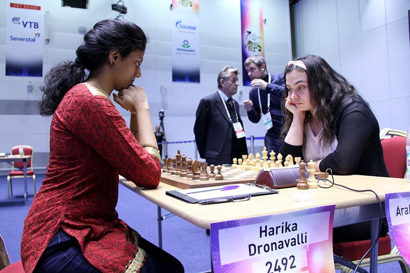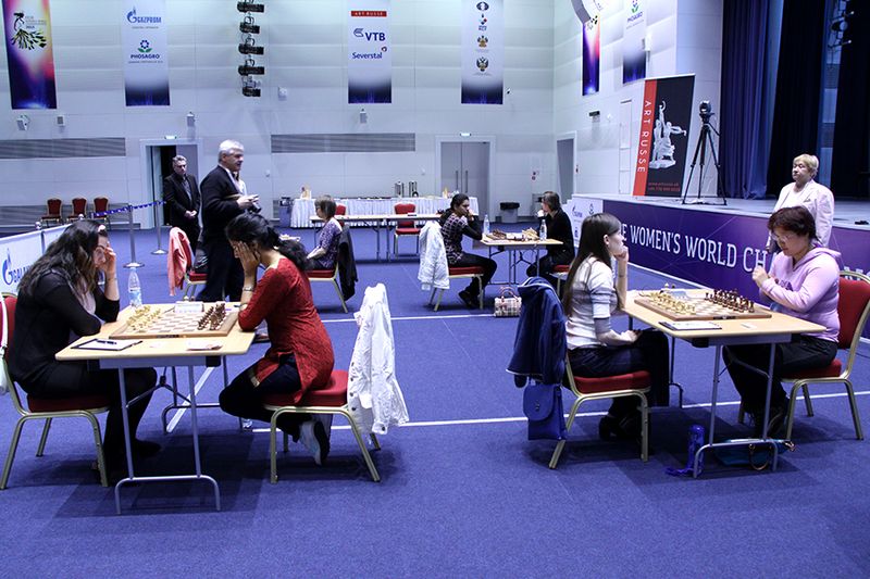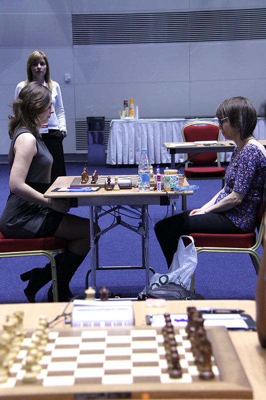 Конеру целеустремленно действовала на выходе из дебюта, создав давление по открывшейся линии «а». М.Музычук бросила на произвол судьбы крайнюю пешку и обозначила стремление начать штурм на королевском фланге. Чувство опасности изменило Хампи, она отвергла варианты с предложением размена ферзей, в результате три ее фигуры оказались на краю доски вдали от короля. На 25-м ходу черные обязаны были разменять ладьи, но вместо этого совершили грубый просмотр, позволивший Марии нанести сокрушительный удар, основанный на слабости последней горизонтали.