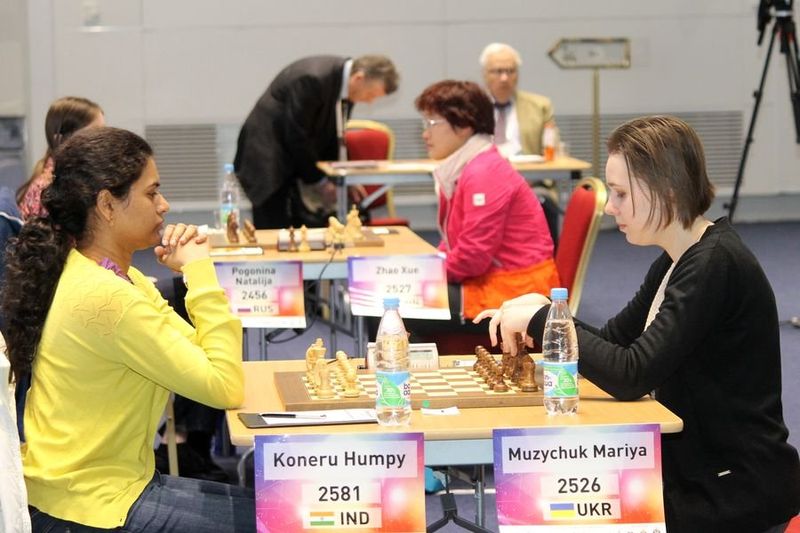 Конеру в антимеране пошла на очень сложную позицию, уже на 9-м ходу применив не встречавшееся на практике продолжение. М.Музычук получила хорошую игру в миттельшпиле, но отступлением коня на 27-м ходу передала инициативу сопернице. Выиграв ферзя за две ладьи, Хампи могла тут же пожертвовать коня и собрать богатый пешечный урожай. Прельстившись пешкой b5, она рисковала упустить перевес после 35…Ba5. Мария не использовала эту возможность, сразу после контроля белые все-таки забрали конем «правильную» пешку е4, и положение черных стало безнадежным.