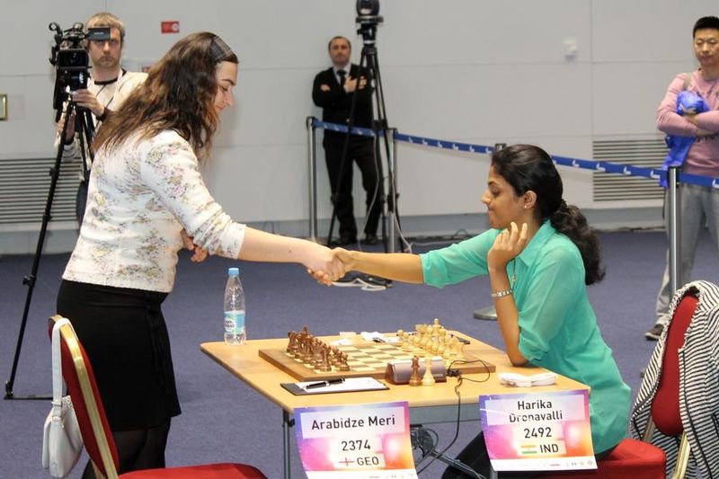 Харика непритязательно разыграла дебют, Арабидзе, имея выбор между длинной и короткой рокировкой, также предпочла более спокойный план. После двадцати с небольшим ходов на доске возникло четырехладейное окончание с незначительным плюсом у белых за счет более здоровой пешечной структуры. Вероятно, взятие на 34-м ходу на d4 ладьей позволило бы Арабидзе избежать долгих мучений. При продолжении в партии ее ладьи уперлись в собственную пешку. Пассивная игра в конце концов привела к потере пешки и опасной позиции, где любая ошибка была чревата поражением. В табличном окончании «ладья с крайней пешкой против ладьи» огрехов не избежали обе соперницы, но промах на 77-м ходу Харика уже не простила.