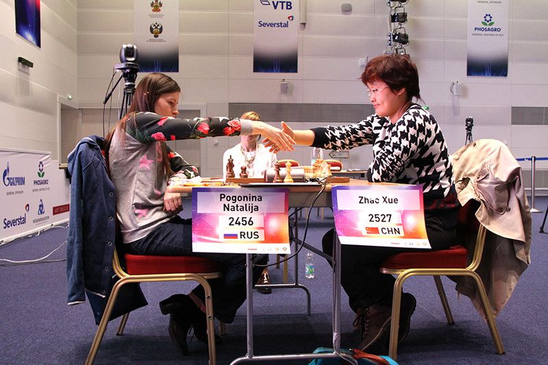 Наталья Погонина после победы во втором круге над Цзюй Вэньцзюнь преградила дорогу к титулу еще одной шахматистке, много лет входящей в китайскую сборную. Первую партию тай-брейка россиянка играла черными и снова применила волжский гамбит. Чжао Сюэ не внесла принципиальных изменений в трактовку дебюта, черные получили за пешку длительную инициативу на ферзевом фланге. По забавному совпадению, Наталья снова в миттельшпиле упустила тактический укол 22…Na3, с помощью которого можно было выиграть качество (вчера аналогичная возможность подвернулась ей на 23-м ходу), и опять судьба партии была решена в районе 40-го хода. После ошибочного размена на b2 (правильно было 40.Rc2) положение Чжао стало критическим. Изобретательное 41.Nd3 еще позволяло ей продолжить борьбу; не обнаружив этого тактического ресурса, китаянка вскоре понесла тяжелые материальные потери. В ответном поединке она после долгих маневров в напряженной позиции староиндийского типа допустила вскрытие королевского фланга в крайне невыгодной для себя обстановке. Получив выигрывающую атаку, Погонина зафиксировала ничью повторением ходов и вышла в полуфинал.