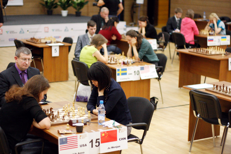 После двух довольно ровных ничьих в 25-минутных партиях Цзюй Вэньцзюнь и Анне Затонских пришлось играть две десятиминутки. В первой у Анны не выдержали нервы, она сначала без необходимости пропустила черные фигуры в свой лагерь, а затем необдуманно ринулась ферзем в неприятельский.