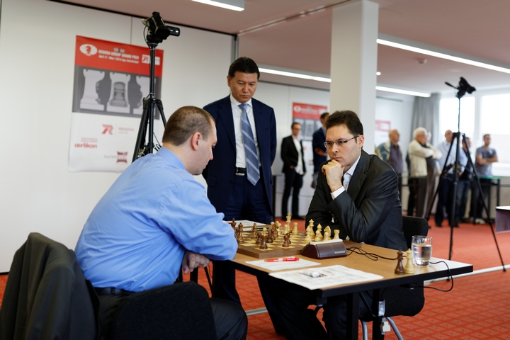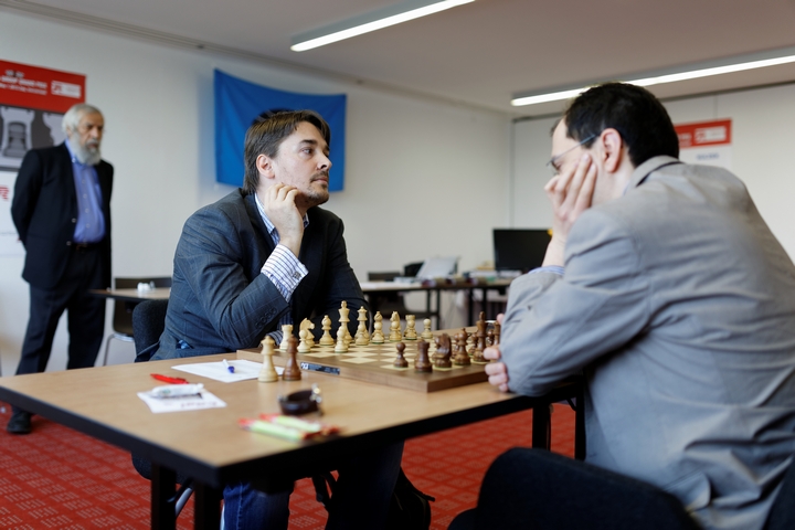 Леко против Камского в открытом варианте испанской застал соперника врасплох, применив редкий ход, встречавшийся в партиях Боголюбов – Эйве (1928) и Фишер – Унцикер (1966), а также еще в одной партии юного Ананда. 21-м ходом белые могли получить реальные шансы на победу, однако поторопились забрать пешку и уступили инициативу. Перед первым контролем возникла позиция динамического равновесия, и партнеры пошли на повторение ходов.