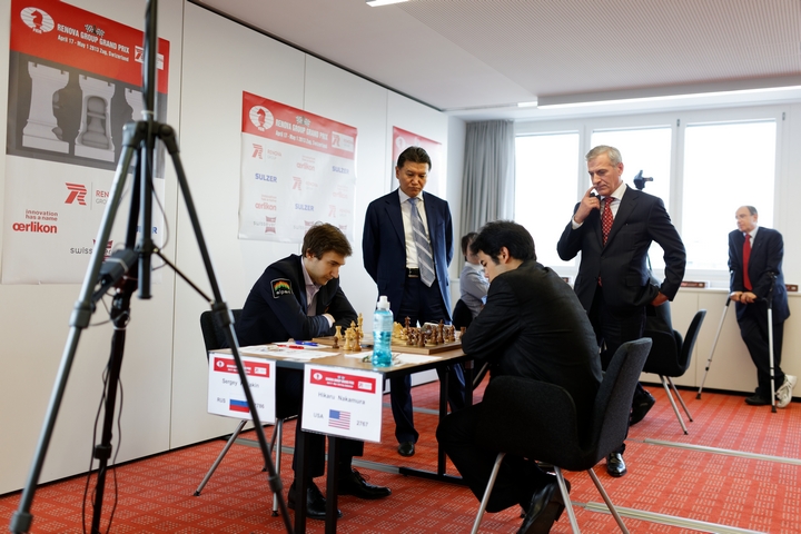 Карякин к поединку с Накамурой подготовил новую идею в варианте французской защиты, который у них раньше встречался в игре вслепую, однако проблем не поставил и вскоре оказался в роли защищающейся стороны. В той партии Накамура в итоге «отработал» ничью на 124-м ходу в эндшпиле «ладья против ладьи и слона» и в этот раз не отказал себе в удовольствии помучить соперника. Мирное соглашение было подписано после 107-го хода белых.