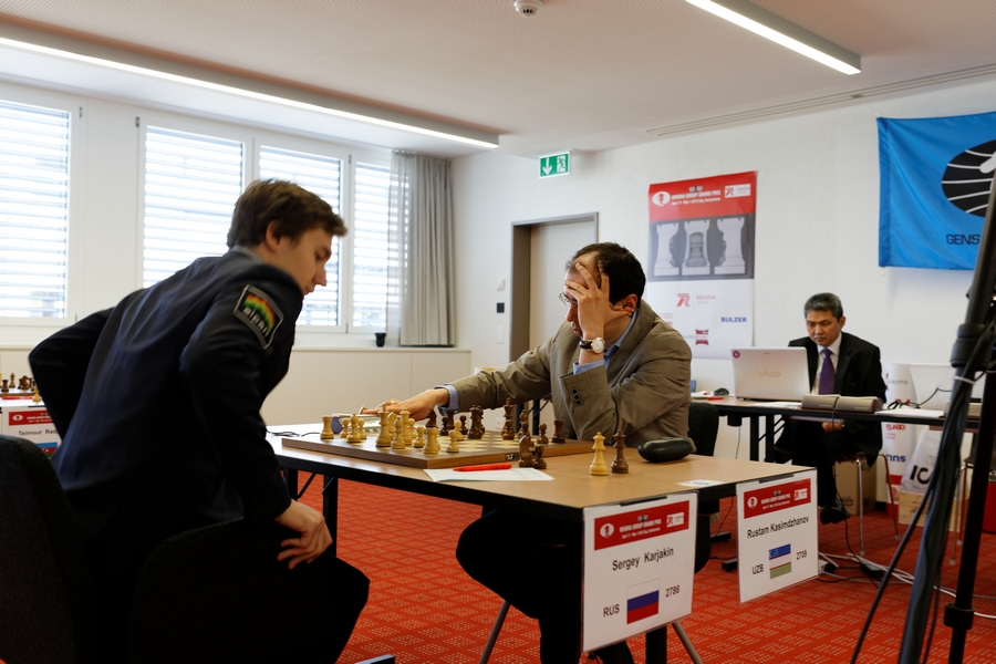 Карякин против Касымжанова разыграл вариант шотландской, который прежде неоднократно отстаивал черными. Касымжанов применил новое продолжение и через несколько ходов с помощью жертвы качества получил проходную пешку, застраховавшую его от неприятностей.