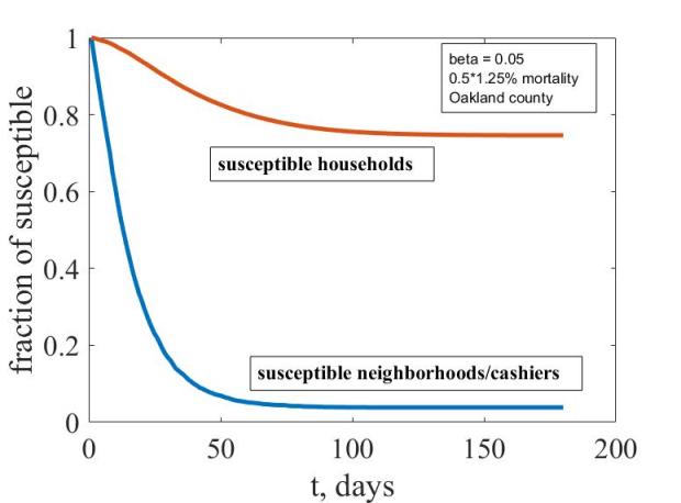 Спасибо за ссылку и идею графика. Вот результаты моей модели для разумных параметров выше: бета = 0.05, смертность = 0.63 процента, Окландская область. Кривые показывают отношение количества здоровых к общему населению. Верхняя кривая - процентное отношение здоровых домов, нижняя - процентное отношение здоровых кассиров. У меня эффект сильнее: переболело 95 процентов кассиров и 25 процентов населения (даже меньше чем 25: в каждом заболевшем доме скорее всего болеют не все, а, скажем, двое из трёх). Примерно как Вы и прогнозировали.