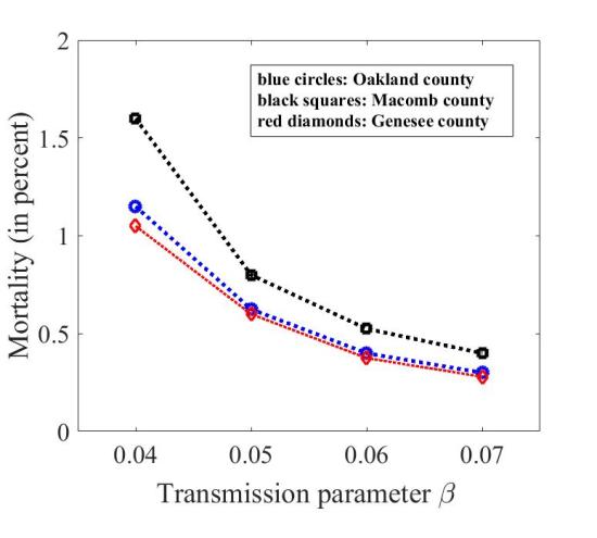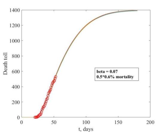 Как мы видим, кривые, к сожалению, не пересекаются. Тем не менее, в области низких бета и высокой смертности они расходятся. Кроме этого, эта область параметров плохо подходит, поскольку из неё следует, что всё уже завершается, а оно даже совсем нет. Если идти в область меньшей смертности, то кривые сближаются. Но совсем далеко направо в этом графике не уйдёшь по следующей причине. Для больших значений бета и малой смертности эпидемия в самом разгаре и количество заболевших огромно. Скажем, в нашем окландском районе для бета = 0.07 и смертности в 0.3 процента заражено уже примерно четверть населения. Это перебор, что видно хотя бы по результатам тестирования: положительных результатов примерно четверть. А ведь это группа риска, люди с симптомами. Отсюда следует, что мы находимся примерно в середине фазовой плоскости наших двух параметров. Я бы сказал, что реальная смертность находится на уровне 0.5-0.7 процентов (в Детройте выше) и заражено (переболело) примерно 10-15 процентов населения.