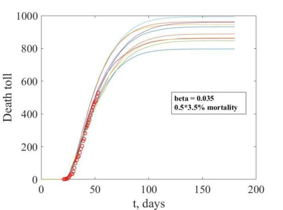 В последнем посте я описывал идею моделирования карантина. Идея воплощена в жизнь, проведено сравнение с данными по мичиганским смертям. Основных параметров два: вероятность заражения при контакте (назовём этот параметр бета) и смертность. Как и у всех порядочных эпидемиологов возникает проблема: тот же график смертей можно получить при слабой эпидемии (бета мало) с высокой смертностью и сильной эпидемии (бета велико) с низкой смертностью. На двух графиках ниже показаны данные про смерти в Окландском районе Мичигана, сначала бета=0.035 со смертностью в 1.75 процента, потом бета=0.07 со смертностью в 0.3 процента. Поскольку симуляции стохастические, на графике приведено десять таких симуляций (с теми же значениями параметров), чтобы был виден разброс.