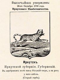 | В официально утверждённом Императрицей Всероссийской Екатериной Второй 26 октября 1790 года гербе Иркутска изображен тигр с соболем в зубах со следующим описанием (дословно): «В серебряном поле щита бегущий тигр, а в роту у него соболь. Сей герб старый». |