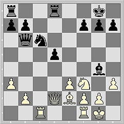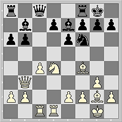 1.e4 c6 2.d4 d5 3.Nc3 dxe4 4.Nxe4 Bf5 5.Ng3 Bg6 6.h4 h6 7.Nf3 Nd7 8.h5 Bh7 9.Bd3 Bxd3 10.Qxd3 e6 11.Bf4 Qa5+ 12.Bd2 Bb4 13.c3 Be7 14.c4 Qc7 15.0-0-0 Ngf6 16.Rhe1 b5 17.c5 0-0 18.Nf5 exf5 19.Rxe7.
