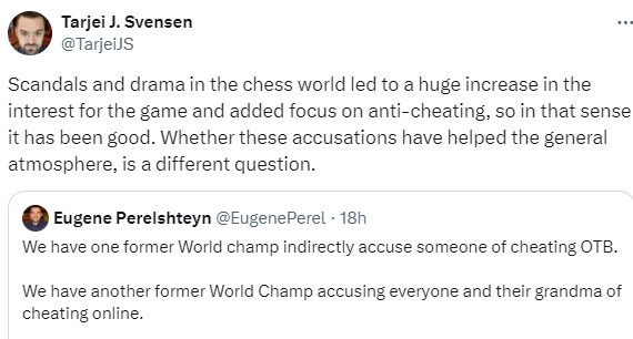 "Индийцы абсолютно доминируют. Я глубоко впечатлен шахматной революцией в Индии. Нынешнее поколение, безусловно, самое сильное. Я ожидаю встретиться с индийцами на каждом супертурнире".