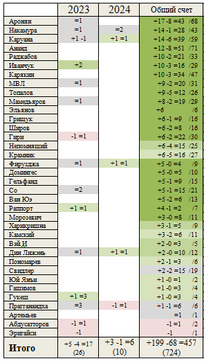 Почитатель: Карлсен почти ушёл из классических шахмат, но всё же пока не ушёл, и свой подавляющий счёт с элитой продолжает наращивать потихоньку. Однако с совсем свежим пополнением элиты, с влившимися уже в этом году (Нодирбек, Прагг, Арджун) счёт пока не так хорош.