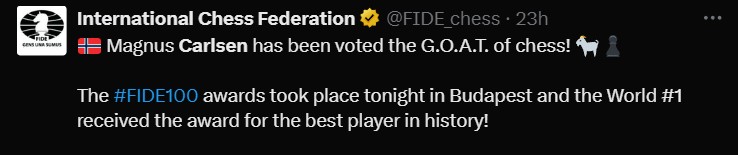 Magnus Carlsen got the FIDE award for the best player in the last 100 years. Magnus said that Kasparov had "a greater career".