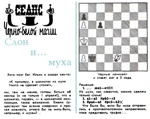 | Vova17: Не соображу в чем прикол. Если муха черная пешка, то она может превратиться и в ферзя и в слона с матом в три хода.