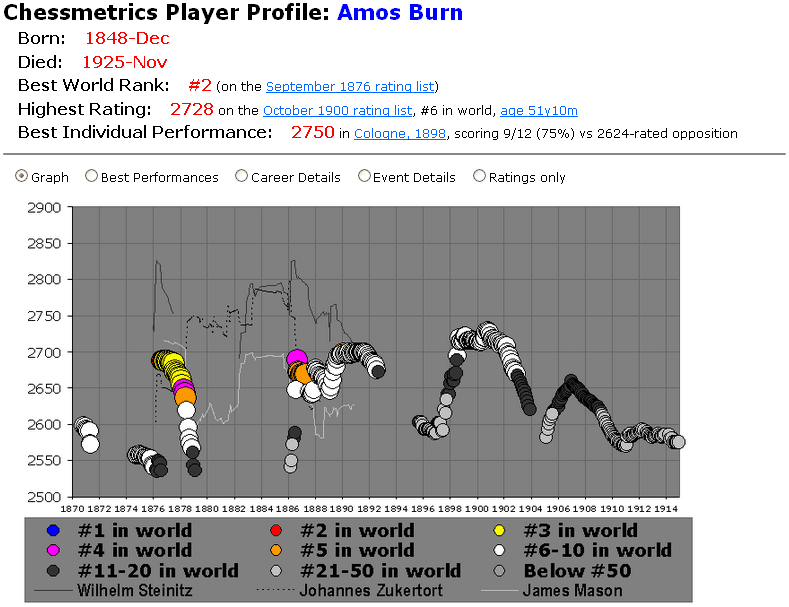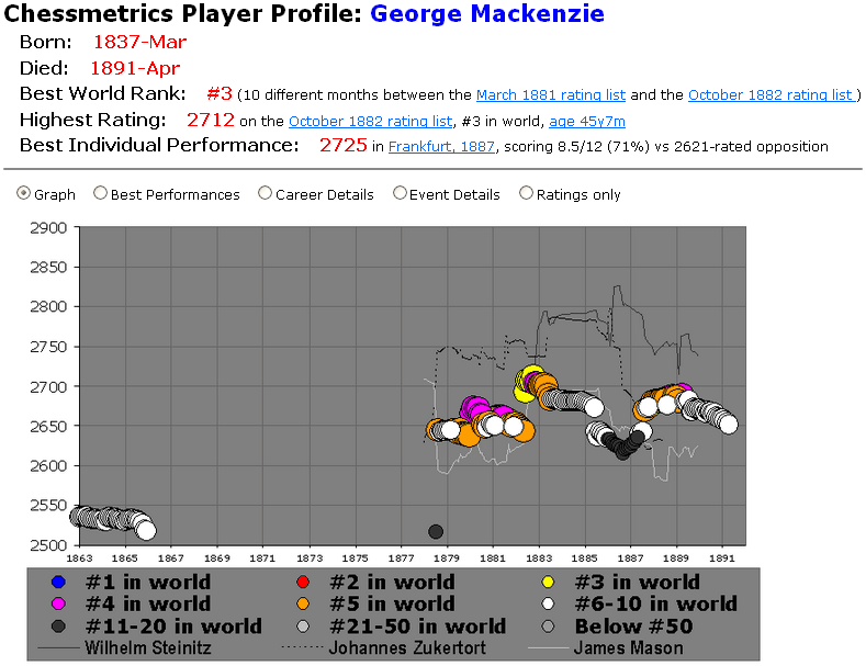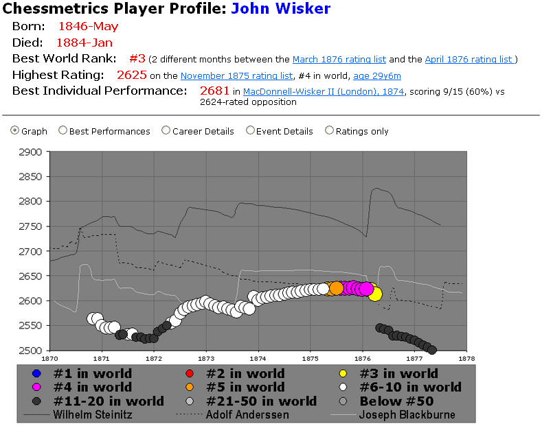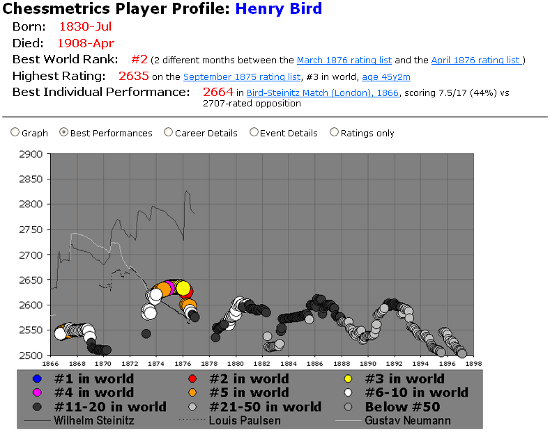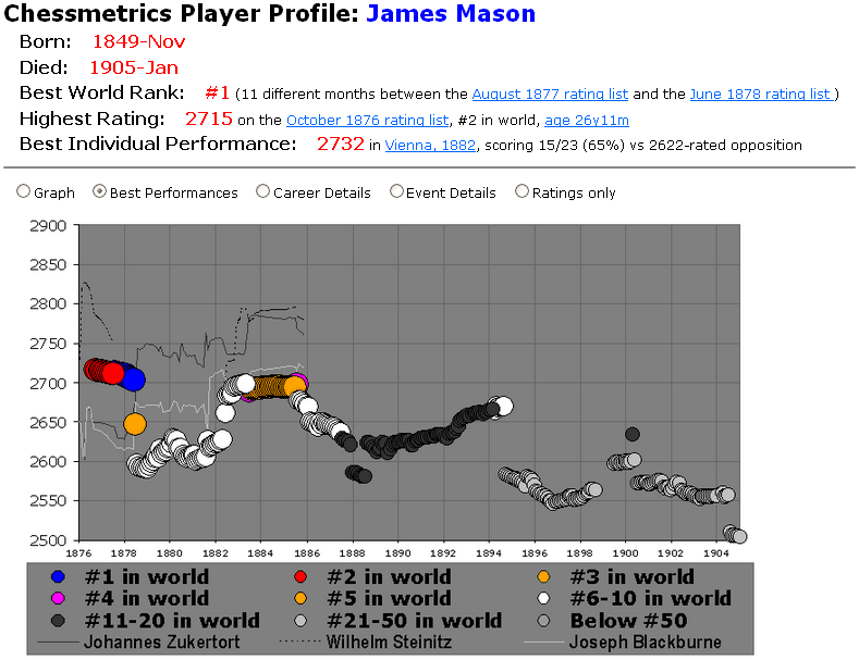 2708 in Bird-Mason Match (New York), 1876, scoring 13/19 (68%) vs 2583-rated opposition