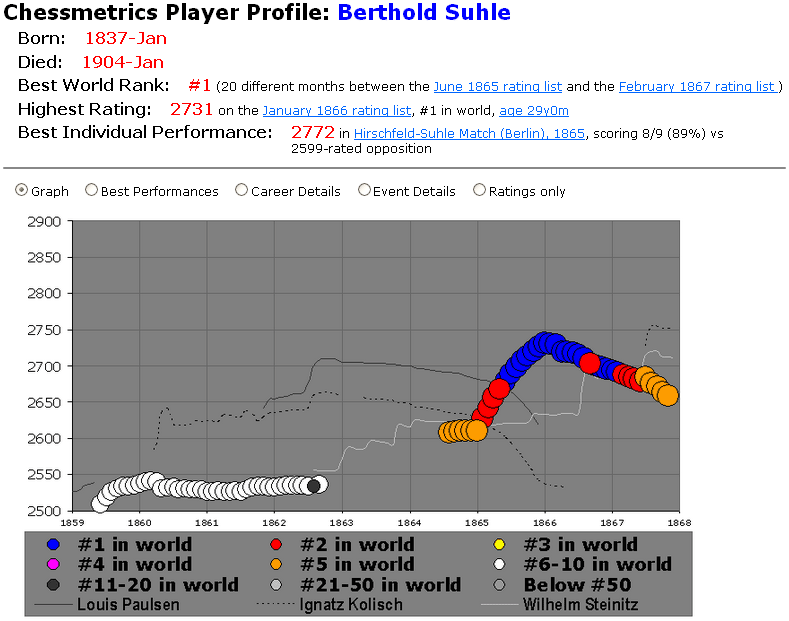 2772 in Hirschfeld-Suhle Match (Berlin), 1865, scoring 8/9 (89%) vs 2599-rated opposition