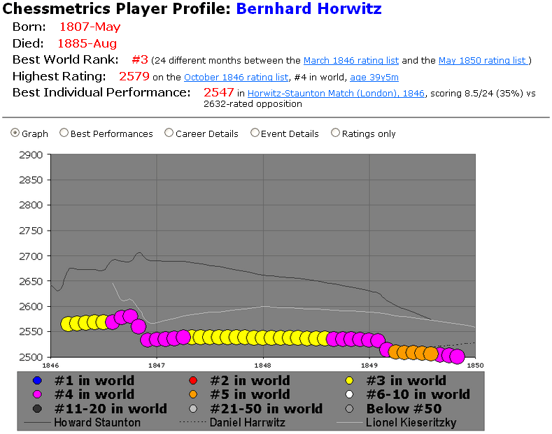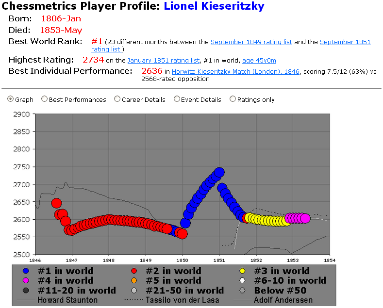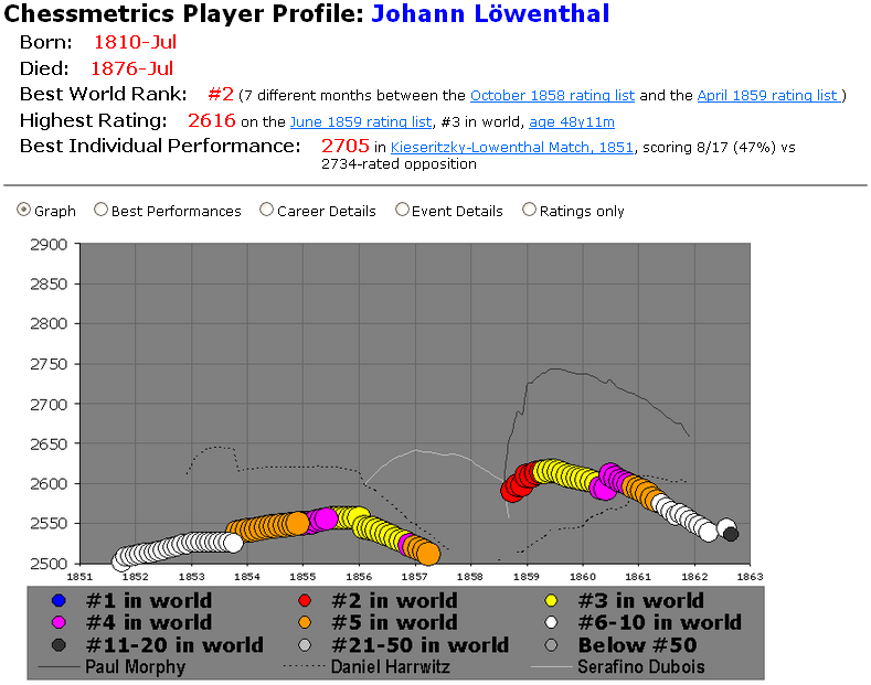 2705 in Kieseritzky-Lowenthal Match, 1851, scoring 8/17 (47%) vs 2734-rated opposition