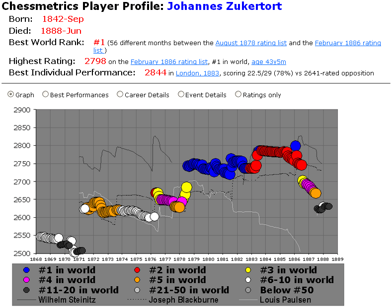 2774 in Anderssen-Zukertort II (Berlin), 1871, scoring 5/7 (71%) vs 2732-rated opposition