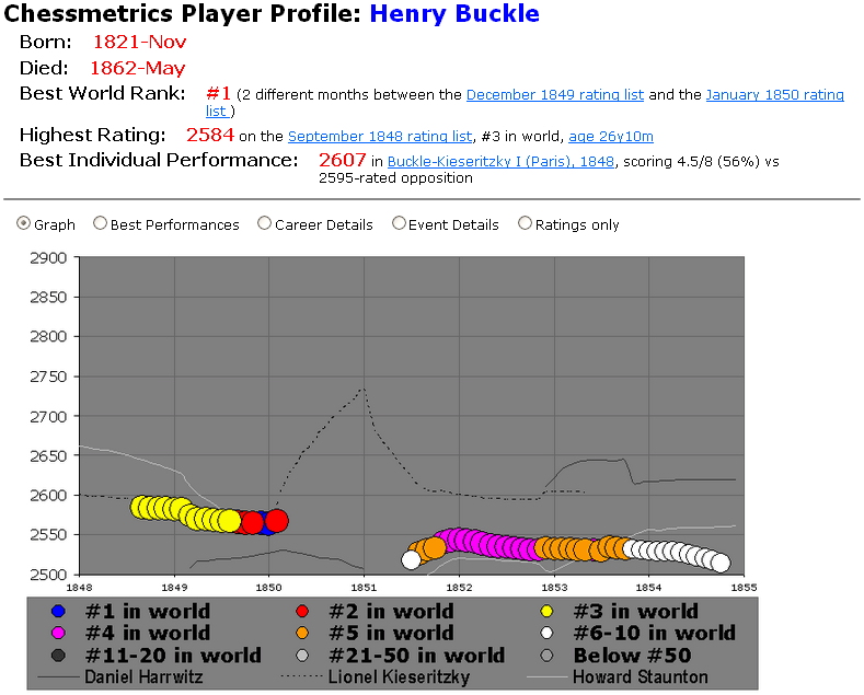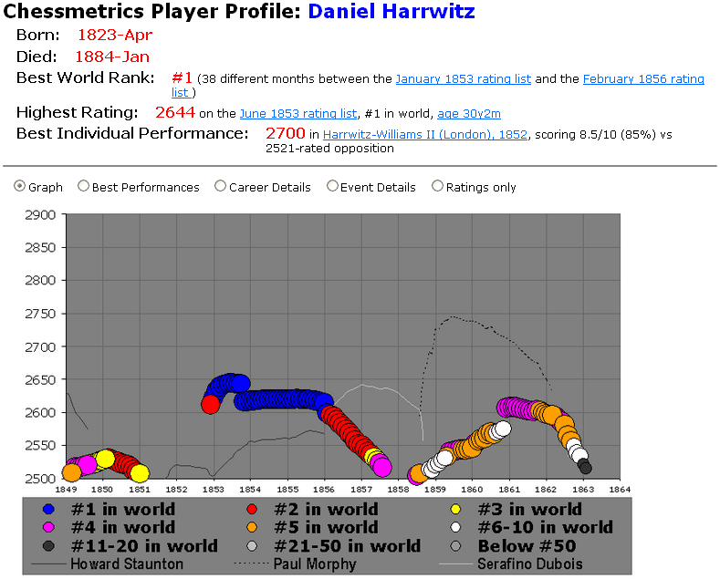 2700 in Harrwitz-Williams II (London), 1852, scoring 8.5/10 (85%) vs 2521-rated opposition