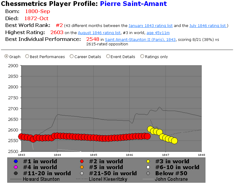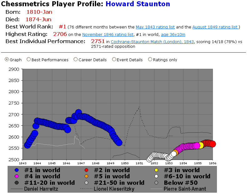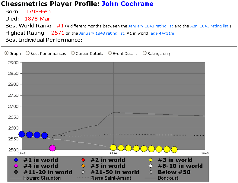 2751 in Cochrane-Staunton Match (London), 1843, scoring 14/18 (78%) vs 2571-rated opposition