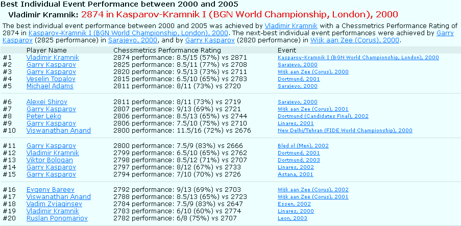 2730 in Gunsberg-Steinitz Match (World Championship, New York), 1890, scoring 10.5/19 (55%) vs 2700-rated opposition