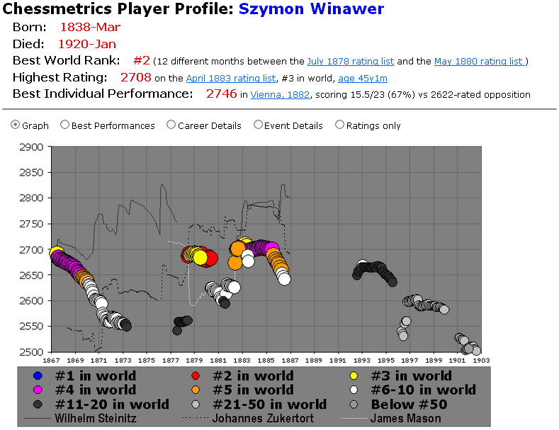 2763 in Vienna, 1873, scoring 12.5/15 (83%) vs 2563-rated opposition