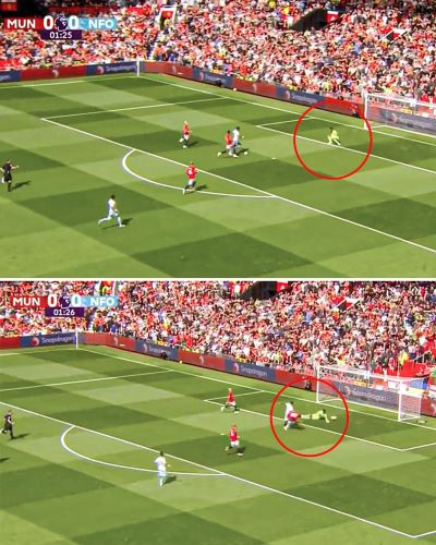 | Андре Онана, похоже, нырнул перед тем, как Тайво Авонийи нанес удар в первом матче «Ноттингем Форест».🤔 |