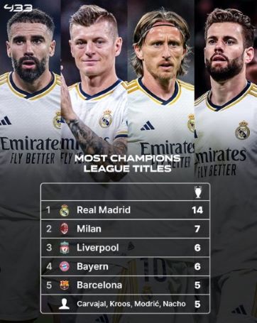 Карвахаль, Кроос, Модрич и Начо могут сегодня обогнать "Барселону" по количеству выигранных титулов Лиги чемпионов