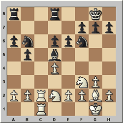 1.Nf3 d5 2.d4 Nf6 3.c4 e6 4.g3 Be7 5.Bg2 0-0 6.Qc2 dxc4 7.Qxc4 a6 8.Bf4 Bd6 9.0-0 b5 10.Qc2 Bb7 11.Nbd2 Nbd7 12.Nb3 Be4 13.Qd2 Qe7 14.Rfc1 Rfc8 15.Bxd6 cxd6 16.Qa5 Rcb8 17.Nbd2 Bd5 18.Rc2 Qd8 19.Qxd8+ Rxd8 20.Rac1 Nb6