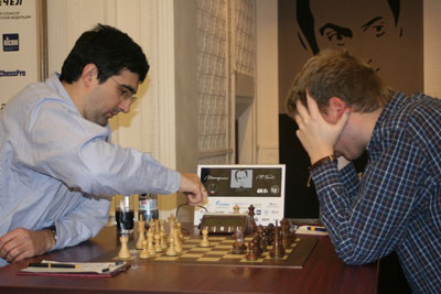 Владимир Барский: Крамник – Широв. Эту эпическую битву долго и добросовестно комментировал на ChessPro Максим Ноткин. По субъективному мнению экспресс-обозревателя, эндшпиль – сильнейшая сторона творчества Широва, поэтому после размена ферзей на 19-м ходу я думал, что ту чуть худшую позицию черные не проиграют. Но, видно, над каталонским эндшпилем, когда белыми фигурами руководит Крамник, висит какое-то заклятие: ход за ходом Владимир перекатал своего техничного и изобретательного соперника. Кстати, обратите внимание на финальную позицию: проходная Крамника опять оказалась неудержимой!
