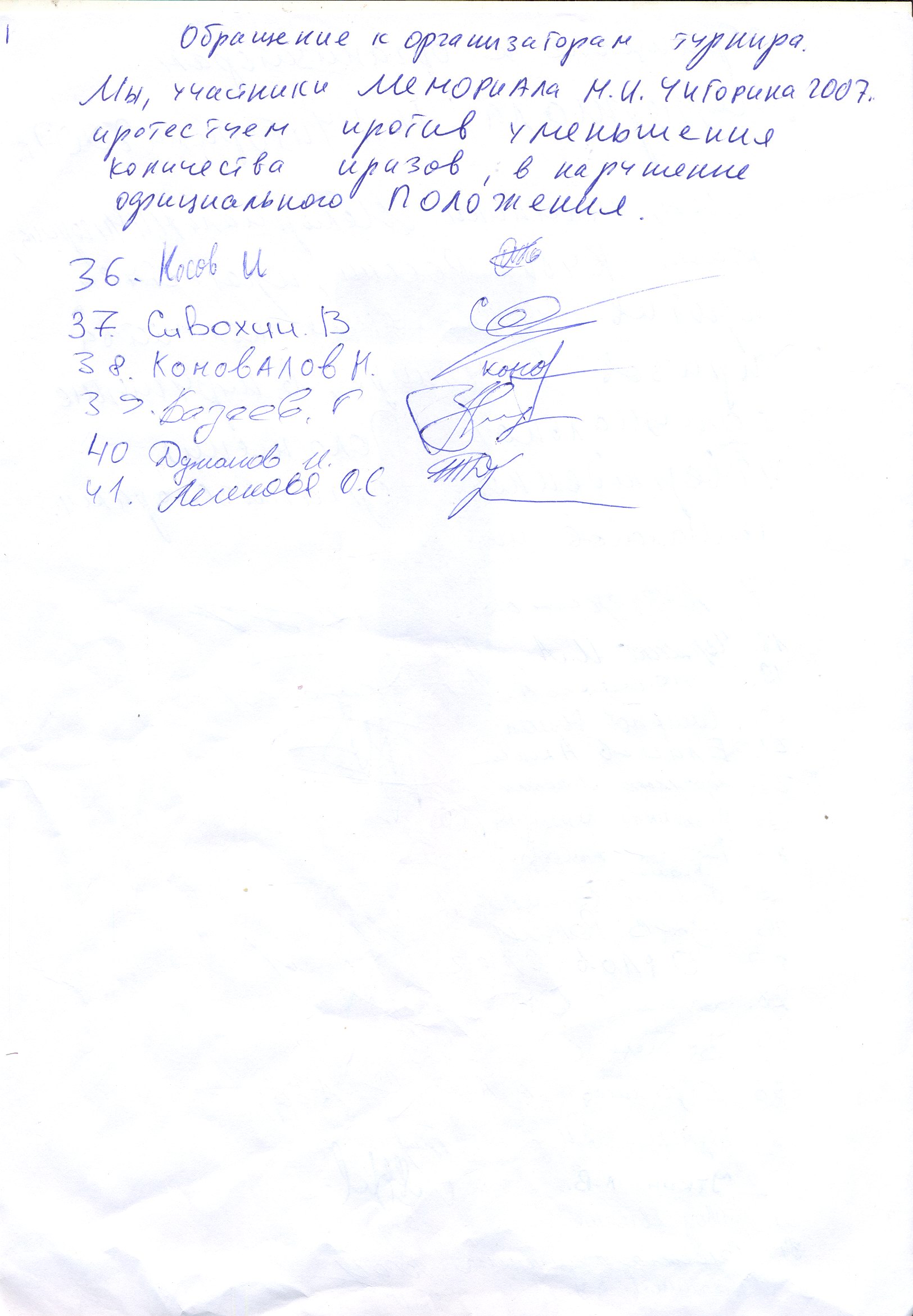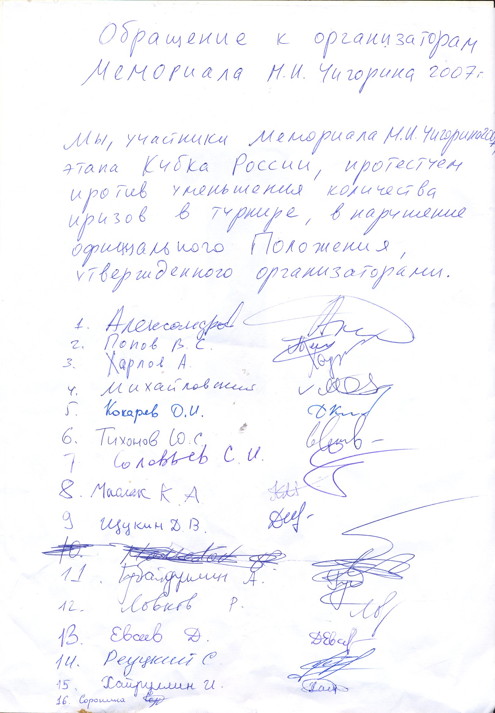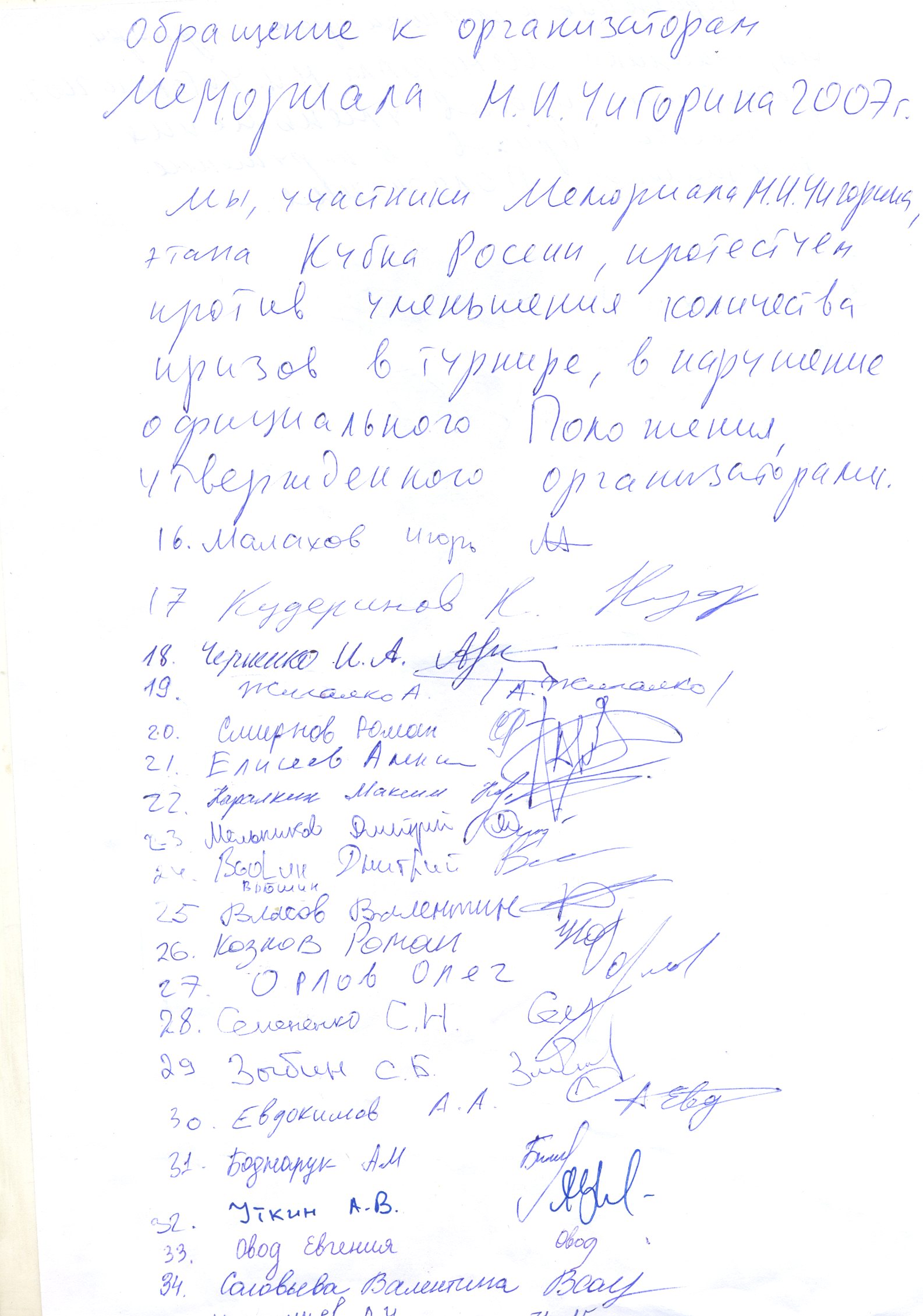В нарушение официального Положения участникам Мемориала Чигорина уменьшили количество призов. Примерно на 400 тысяч. Участниками написан протест, приведенный ниже. Его подписали большинство гроссмейстеров, ну и так , мастера , просто участники, заплатившие серьезные взносы.Ожидается большой скандал. гостевая организаторов |