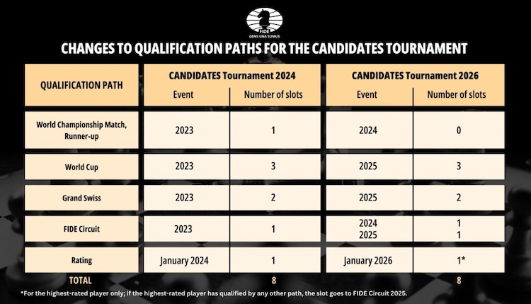 Из Туров 2024 и 2025 будет выходить по одному человеку. Сам Тур станет гораздо более демократичным - круговики не дадут большого преимущества перед сильными швейцарками - более того, нельзя будет отобраться, сыграв только в круговиках.