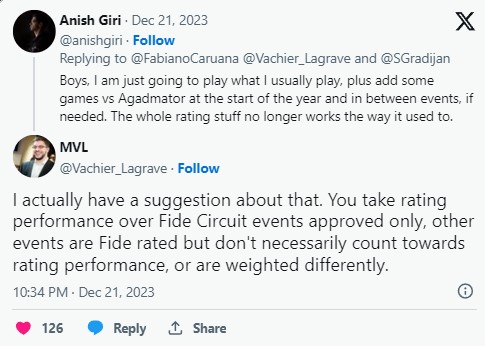| GM Maxime Vachier-Lagrave recently proposed that the rating spot could be determined by performance rating rather than an average rating during the qualification period, a sentiment that Caruana agreed with, but this model has not been adopted in the changes. |