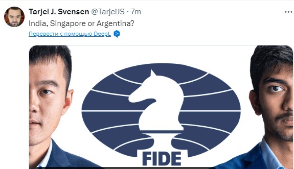Три заявки на проведение матча на первенство мира ФИДЕ-2024. Ченнаи, Сингапур, Нью-Дели (в порядке подачи). Все соответствуют критериям. На следующей неделе Совет ФИДЕ обсудит это - представители претендентов приглашены поделиться подробностями и ответить на вопросы. Окончательное решение в июне.
