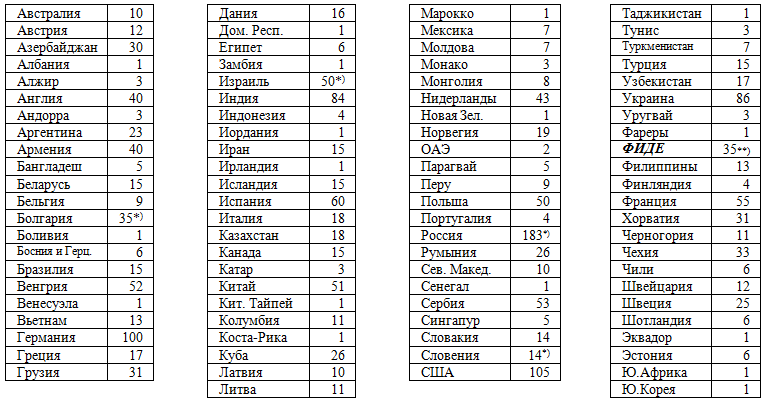 На данный момент в рейтинговой базе ФИДЕ числятся 1826 гроссмейстеров. После последних присвоений и с учетом нескольких трансферов (IvanKlimkov и я о некоторых, но не о всех, упоминали) распределение числа гроссмейстеров по федерациям сейчас таково (двое - Гареев и Рамирес - не числятся ни в какой федерации):