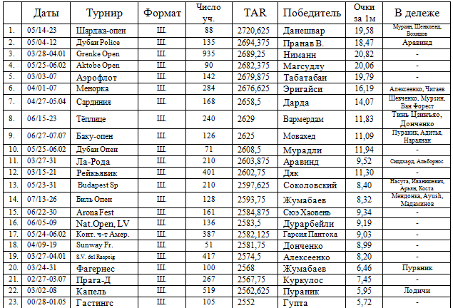 23 опена в зачете "циркуса" на сегодняшний день, ни в одном из них никакими топ-игроками не пахло (да и просто семисотников - единицы). За исключением Эригайси, который свои три опена играл бы все равно, вне всякой связи с ФИДЕ-туром - потому что в элитные круговики не позвали (не успели позвать).